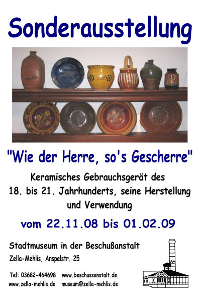 Das Zella-Mehliser Stadtmuseum in der Beschußanstalt verfügt über eine umfangreiche Sammlung traditioneller Thüringer Keramik. Aus diesem Fundus wurde eine Ausstellung erarbeitet, die u.a. auch auf die drei Thüringer Töpferzentren Bürgel, Ummerstadt und Gerstungen eingeht. Sie beschreibt überdies die Verarbeitung des Tons und vergleicht die nach unterschiedlichen Technologien hergestellten Arten von Scherben. Auch die in dem angesprochenen Zeitraum genutzten Schmucktechniken einschließlich der Dekoration mit teils recht deftigen Spruchweisheiten werden dem Besucher vorgestellt.